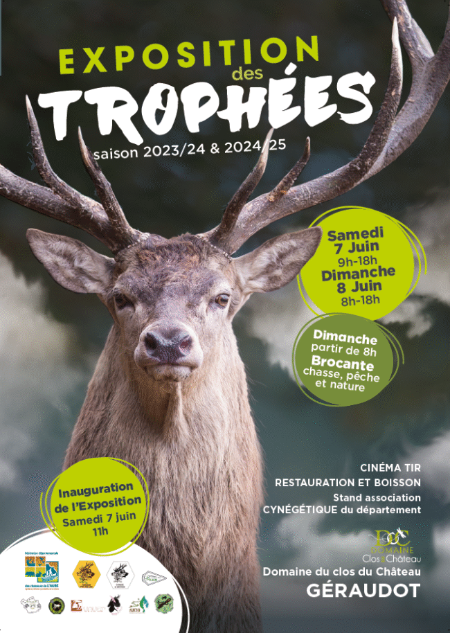Exposition des Trophées ! Samedi 07 et dimanche 08 juin 2025 de 9h00 à 18h00, au Domaine du Clos du Château 10220 Géraudot Durant le week-end, vous aurez l’occasion de pouvoir découvrir les trophées de Cerfs prélevés dans notre département sur les saisons 2023/2024 et 2024/2025 ainsi que de rencontrer les associations cynégétiques du…