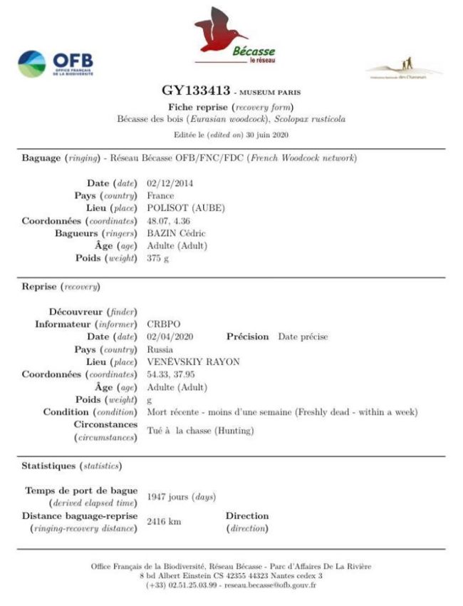Une bécasse des bois avec une bague Auboise pendant 6 ans ! 1947 jours et 2416 kms plus loin ! Notre bécasse visitant l’Aube en hiver 2014 a été prélevée à la chasse en avril dernier en Russie !
