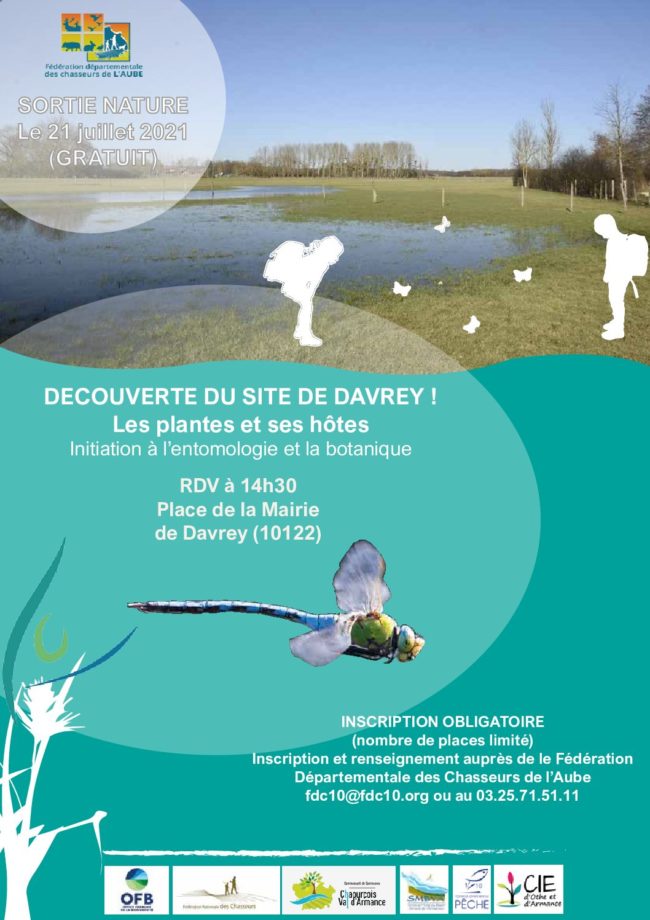 Vous êtes intéressés par la découverte de nouveaux milieux ? Venez visiter le site de Davrey avec la Fédération Départementale des Chasseurs de l’Aube ! Rendez-vous mercredi 21 juillet 2021, place de la Mairie de Davrey à 14h30, attention les places sont limitées, inscription à la FDC 10 obligatoire (03.25.71.51.11)