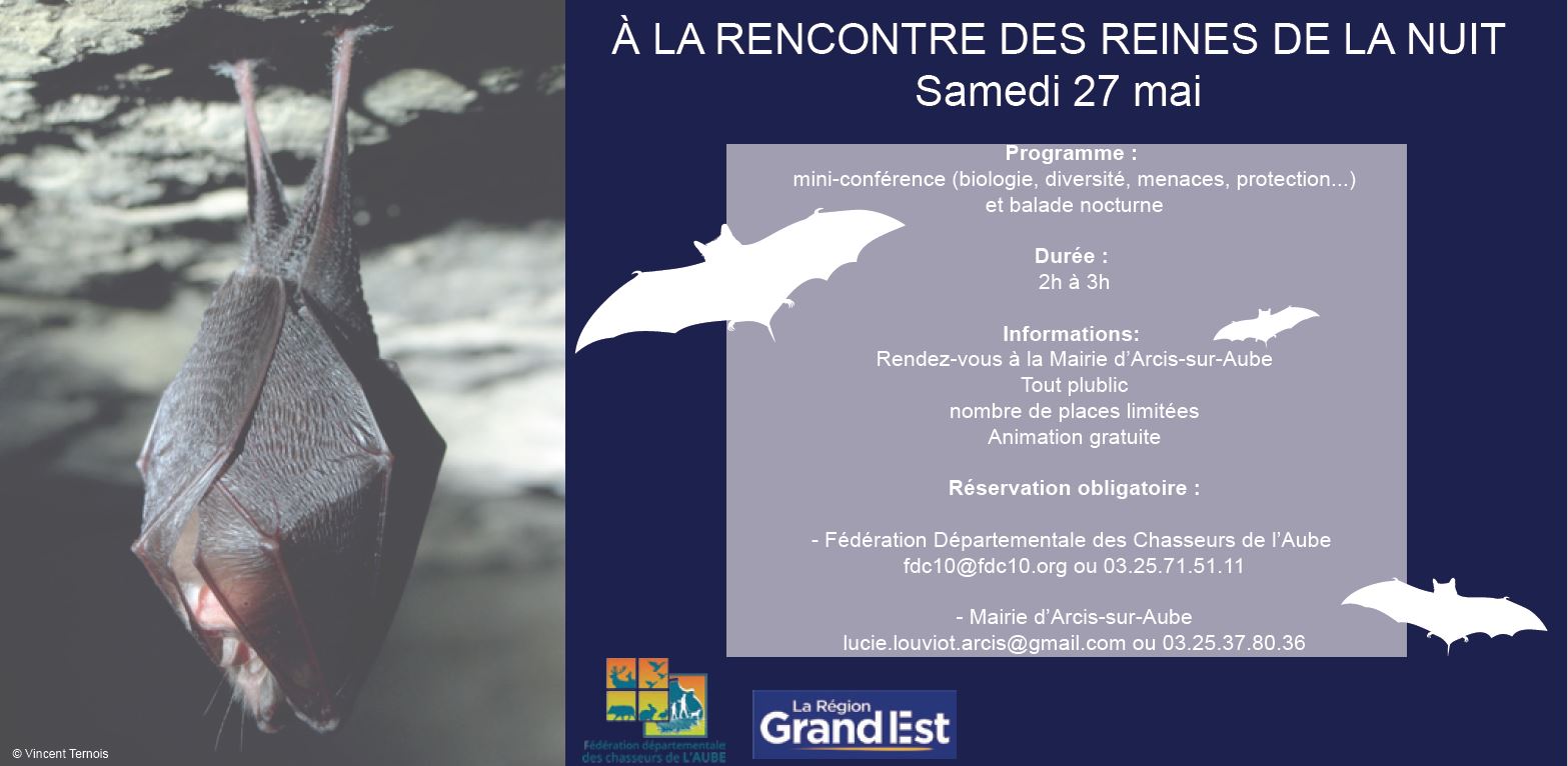 Durant une conférence d’environ 1h30, un animateur de la Fédération des Chasseurs de l’Aube présentera les différentes chauves-souris, leur régime alimentaire, l’intérêt de la préservation des gites et des nichoirs. Il réalisera également un focus sur la pollution lumineuse, dramatique pour un grand nombre d’insectes. Ensuite, pendant 1h00, en utilisant le parcours d’une balade arcisienne, l’animateur et le groupe essayeront d’identifier les différentes espèces de chiroptères présentes sur le site.